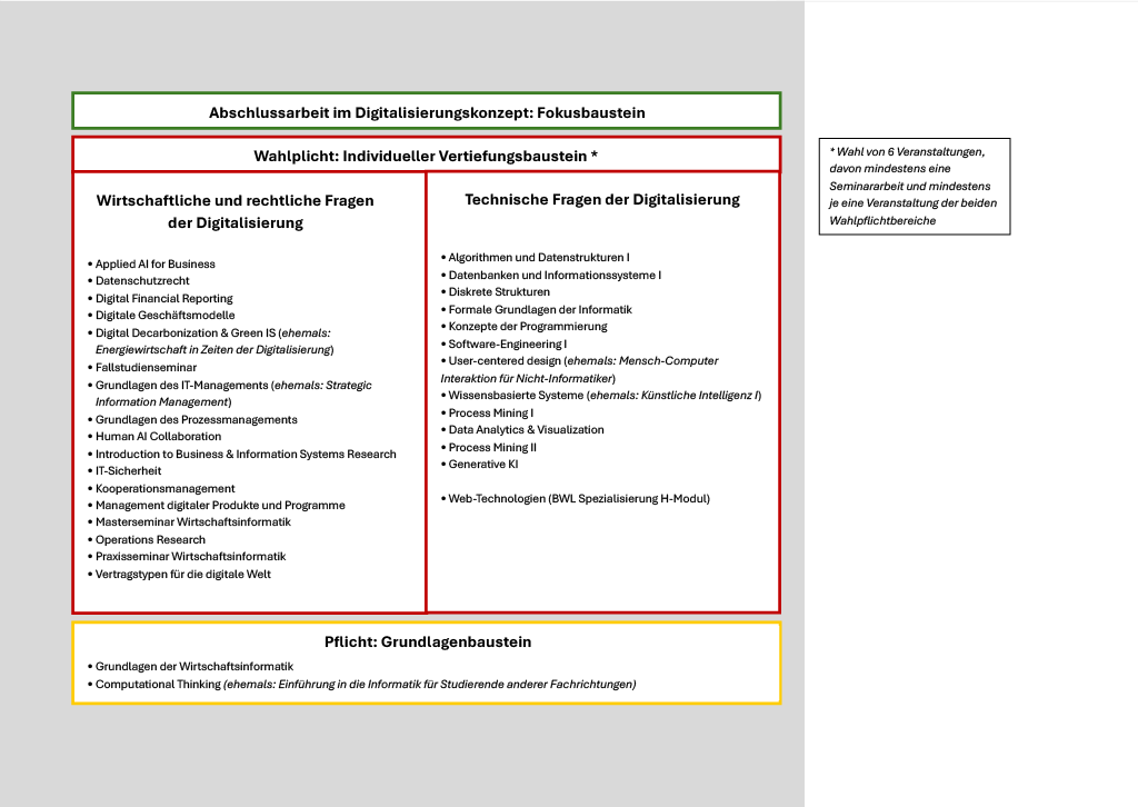 Der Lehrstuhl für Wirtschaftsinformatik bietet Masterstudierenden aller Fachrichtungen der Universität Bayreuth die Möglichkeit zum Erwerb des Zertifikates Digitale Wirtschaft. Hierdurch soll Fachwissen aus der Wirtschaftsinformatik und Informatik vermittelt werden und zusammen mit weiteren Studieninhalten zu einer Profilierung im Bereich der Digitalisierung führen.