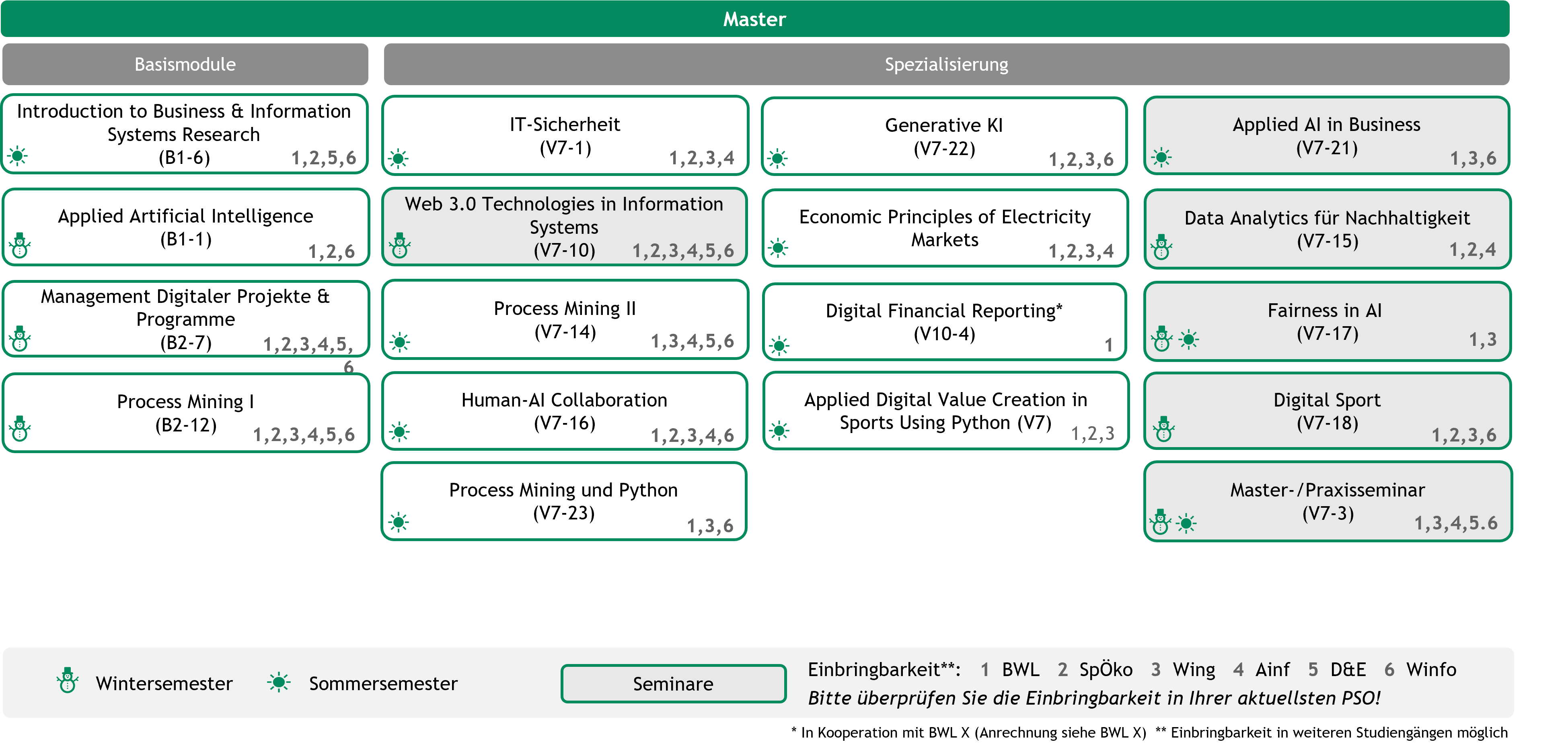 In der untenstehenden Grafik finden Sie alle Veranstaltungen der Wirtschaftsinformatik, die in der Vertiefung einbringbar sind. Um zu entscheiden, welche am besten zu Ihnen und Ihrer Orientierung im Studium passen, sind die Veranstaltungen geclustert und nach Themenbereichen geordnet (Business Analytics und Künstliche Intelligenz, Digital Life, Digitale Prozesse und Produkte und digitales Nachhaltigkeitsmanagement). Außerdem sind zu diesen Themenbereichen bereits die Basismodule der Wirtschaftsinformatik zugeordnet (grau eingefärbte Kästen).